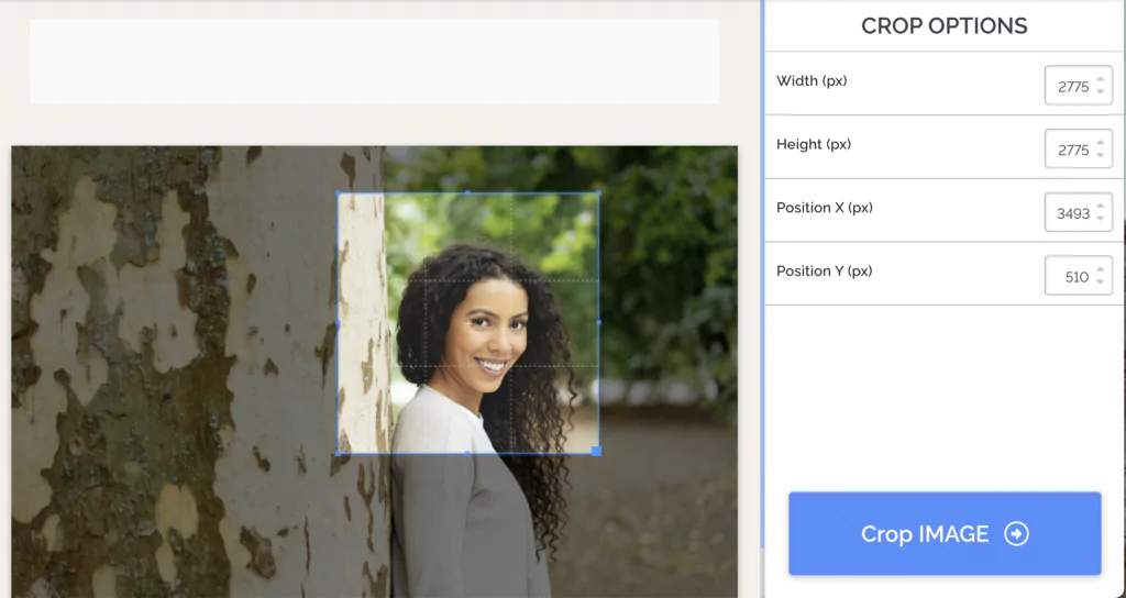 Dann nimmst du deine reduzierte Datei und schneidest dir den gewünschten Ausschnitt zu. Auf ILoveImage kannst du ganz einfach und schnell dein Foto zuschneiden. Wir suchen uns hier die Dame aus, die wir zuschneiden. Da wir ein quadratisches Bild benötigen, achten wir darauf, dass Höhe und Breite den gleichen Wert aufweisen.