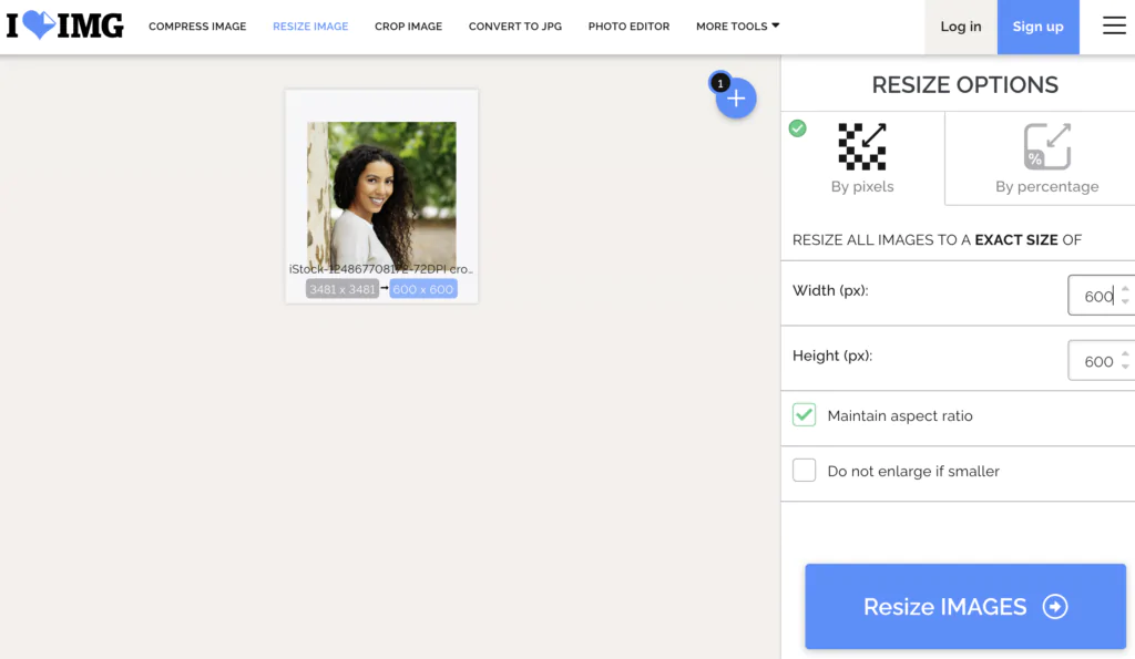Du hast nun den richtigen Bildausschnitt. Jetzt benötigst du noch die richtige Bildgröße. Normalerweise hat jedes Bild, das auf einer Website verwendet wird, eine vorgegebene Bildgröße. Frage hier deinen Webdesigner, falls du keine Angaben dazu bekommen hast. Ein perfektes Tool für das Festlegen der richtigen Bildgröße findest du wieder auf ILoveImage. Wir verkleinern das Bild nun auf 600px mal 600px.